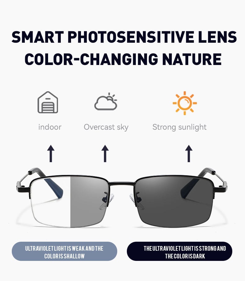 Designed for active lifestyles, these glasses seamlessly combine photochromic technology that adjusts to changing light conditions, with the convenience of bifocal lenses for clear vision at both near and far distances. Perfect for middle-aged and senior individuals, these glasses offer a comfortable and functional solution for everyday use, whether you're enjoying outdoor activities or relaxing at home. With a modern, sporty design and advanced features, they provide both visual clarity and protection in one versatile pair of glasses.